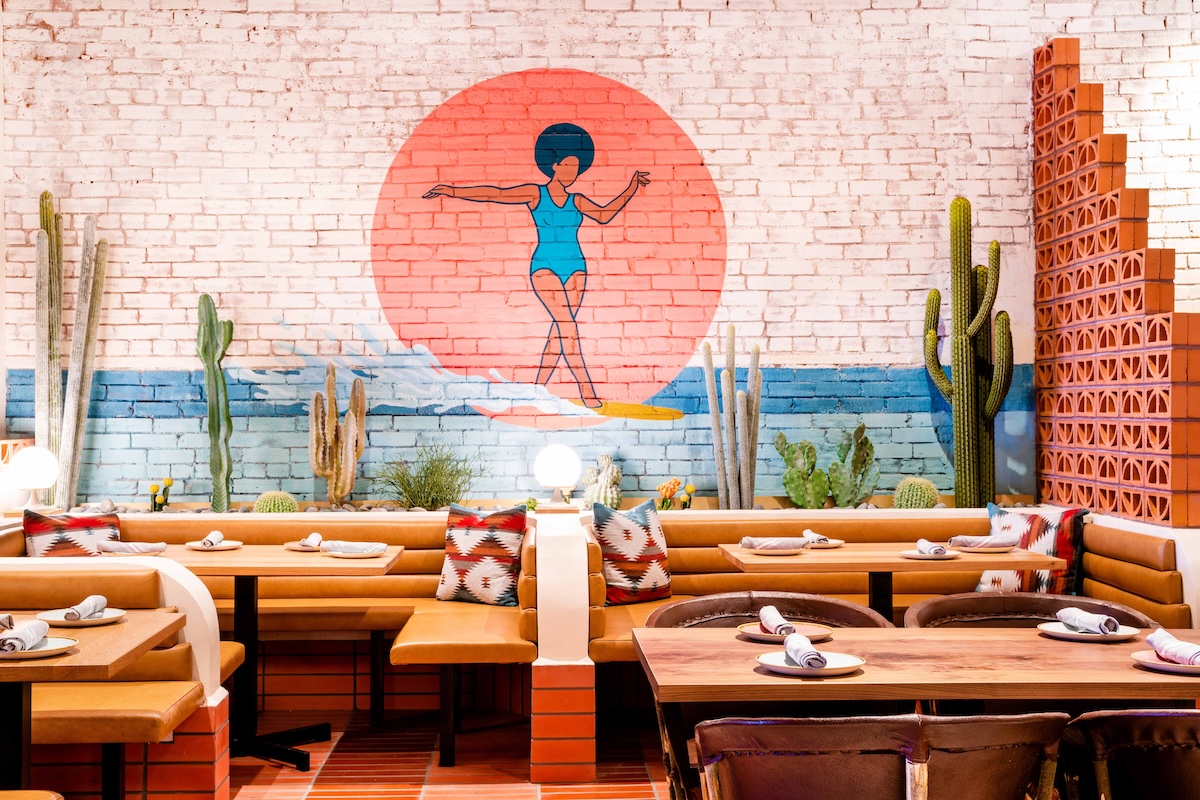 The laid back desert-meets-sea design includes paintings of surfers, hanging swing chairs, cacti gardens, and Aztec-patterned throw pillows and upholstery. Local artist Lindee Zimmer crafted the murals at both locations, including the Instagram-ready one at the Belmar location with warm sunset hues. 7519 Grandview Ave. Arvada and 7167 W. Alaska Drive, Lakewood; nomadakitchen.com