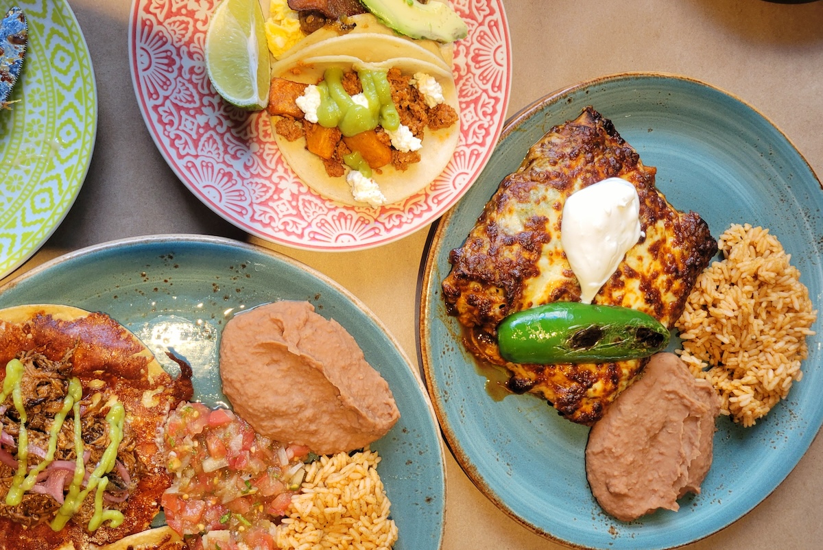 The rest of the menu leans heavy on the New Mexican-Mexican side, offering fan favorites such a smothered, burrito with chorizo, asadero, and eggs ($13). The calabacitas enchiladas ($20) surprised with earthy notes thanks to the squash, and a thick cheesy coating browned to perfection. Don’t skip the platanos con crema ($6), an appetizer that could easily be a side dish. Either way, the tender, sweet-yet-savory plantains are a highlight, and not found often on brunch menus.